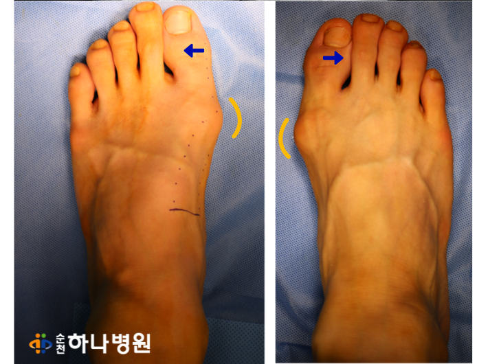 사진 상으로 양측 모두 엄지발가락이 두번째 발가락을